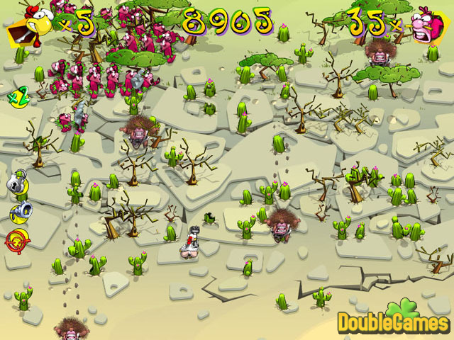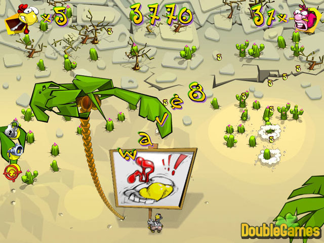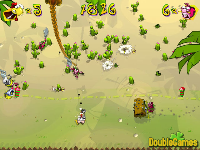 Assume the role of peaceful hen who tries to defend itself against hungry gluttons! The enemy is evil and close on the heels of poor hen. But the hen is not going funk like its ancestors anymore as it has all kinds of weapons to protect its home from the invasion. If a bad guy with hungry look is stopped, he will turn into a cactus. Shoot at cactuses, which block the way, and mine out coins, which appear after such shooting. Don’t forget to pick up some useful bonuses and enjoy this breathtaking adventure!