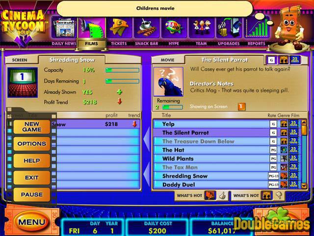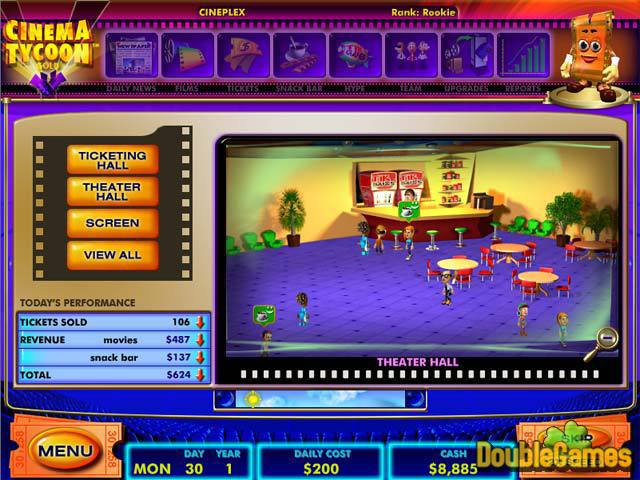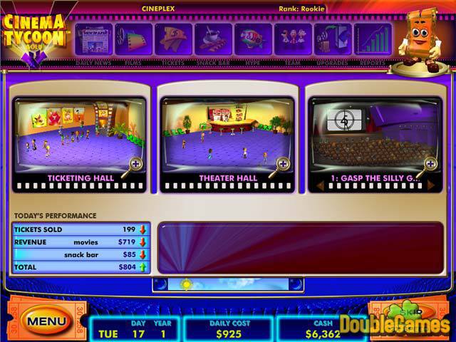 Do you have what it takes to become a Cinema Tycoon? Find out in this exciting and addictive new simulation! Select the movies, buy upgrades, and hype your Cinema to become the next Mega-Plex. Choose the next big Hit, avoid the Flops, and don't forget the competition. Enjoy beautiful graphics, animation and sound. With three unique games and locations, this game offers endless play. Cinema Tycoon promises hours of entertainment - Try it today!