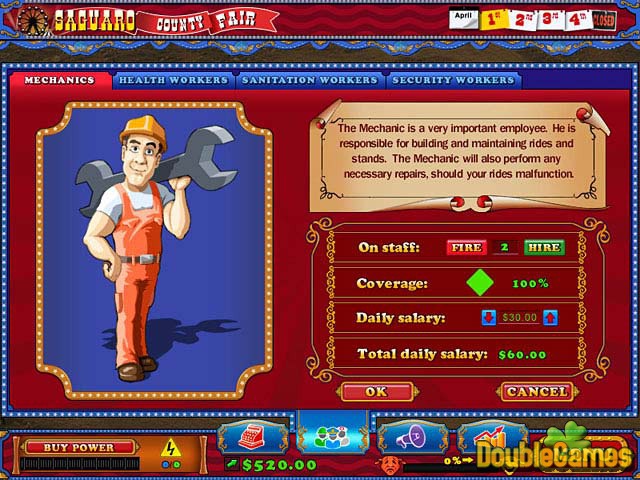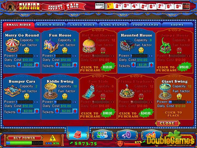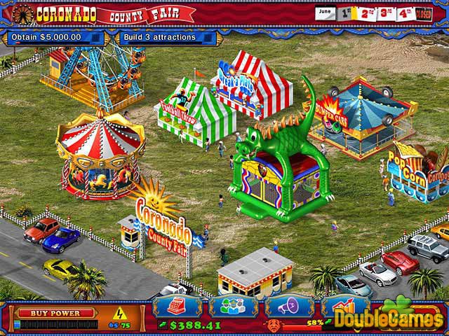 You have just inherited a traveling County Fair from a long-lost relative, but it`s up to you to keep it going. You`ll visit every tourist spot around the county. Each week brings a new locale, and a new challenge. Hire staff, upgrade rides, set up concession stands, manage ad campaigns. People everywhere are clamoring to visit your rides. Don`t let the dream die out, the Fair`s future is in your hands!
