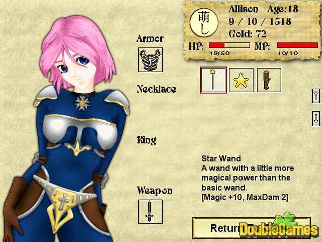 Help an orphaned girl find a path to follow through life. She has some innate skills, but it's up to you to guide her. She can train in classes, work at jobs, make friends, find romance and fight monsters. Dress and design your character as you lead her to one of 50 potential endings. Will she be a princess or a pauper?