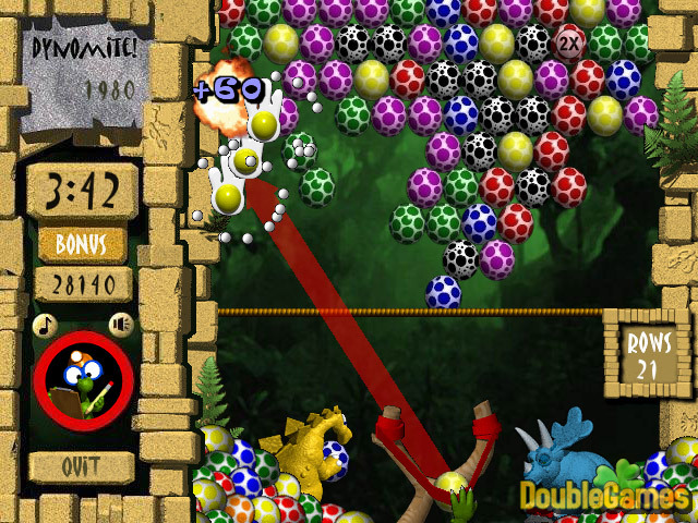 Are you ready for fast-paced online gameplay in this funny puzzle, Dynomite? Deal with dino eggs to crack this challenging puzzle, but keep off their mother as she can be very strict! If something disappoints her, she will go crazy and put her big foot right on you! This frenzied action puzzle makes you clear your playfield from these piles of colored dino eggs. Enjoy these challenging levels and different game modes! You have a unique chance to play Dynomite online at DoubleGames!