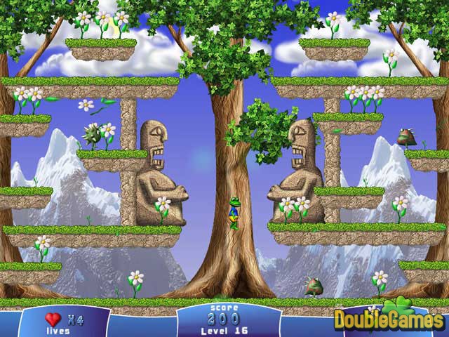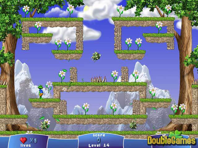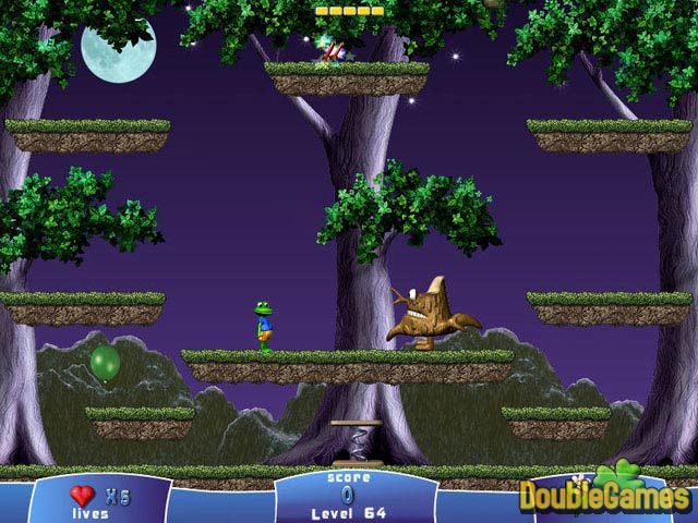 Froggy is just like any other amphibian: He wants to bask in warm sunlight all day, sleep on a cool lily pad at night and eat his fill of insects. But an army of plant-munching monsters has invaded his forest home and is threatening to clear the woodland of its beautiful foliage. Froggy must stretch his powerful legs and send these creatures packing! Guide our hero as he hops from platform to platform, gathering all of the plants before the invading creatures gobble them down. To help, he can blow bubbles that can trap the trespassers and collect powerups that grant him special abilities. All that work makes Froggy hungry, so watch for the candy bonuses that appear when you beat a level quickly. Can you help Froggy save the day? Find out by playing our exciting new arcade adventure!