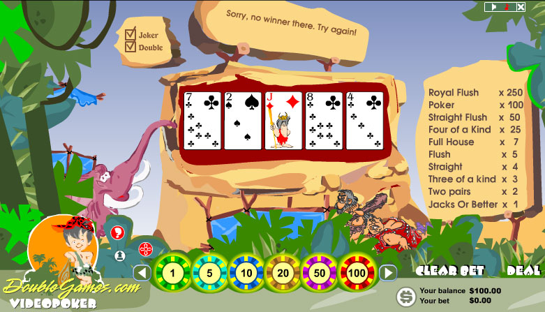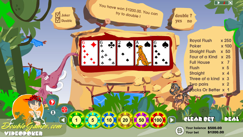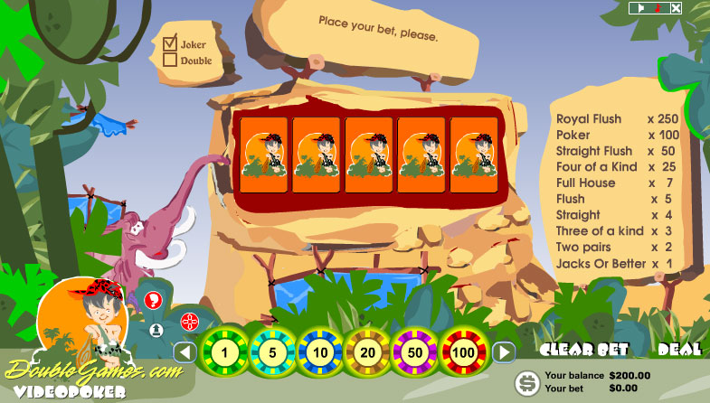 Prehistoric Videopoker is the game of down town Stone Age living. Sharp and sweet, the game has all the charm and drama you would expect from a poker game except it is easier to learn and play. When you download Prehistoric Videopoker you hear funky background tunes echo in the jungle around the video poker machine. You see a mammoth, it helps you by placing your bets with its trunk, and your winnings flow freely into the capture basket. And a caveman who strolls past dragging his prehistoric wife behind him back to the cave. He is extremely indignant at this stupid woman because she has bought a new dress! Just now when he wants to acquire a big axe! He can't realize how it is possible to spend all their wealth, including stones of different colors, sea shells and fangs of a tiger killed by him, and to buy the dress! Because of it, he will injure her face a little bit and then he will force her to exchange this dress to the axe. Yes, there is plenty to see and be entertained by in this unique Prehistoric Videopoker game. There is plenty to win too and the more you practice the more skills you acquire giving more chance to win. The beauty of Prehistoric Videopoker is you can play poker by yourself. You can hold the cards you choose and be dealt again to have more chances of being a winner. Simply click on the cards you wish to hold. If you change your mind you can click again to un-hold them. This game is a variation of the classic game of poker, but you will love its style and humor. It is a game where you can enjoy at the fun of poker from your own computer.