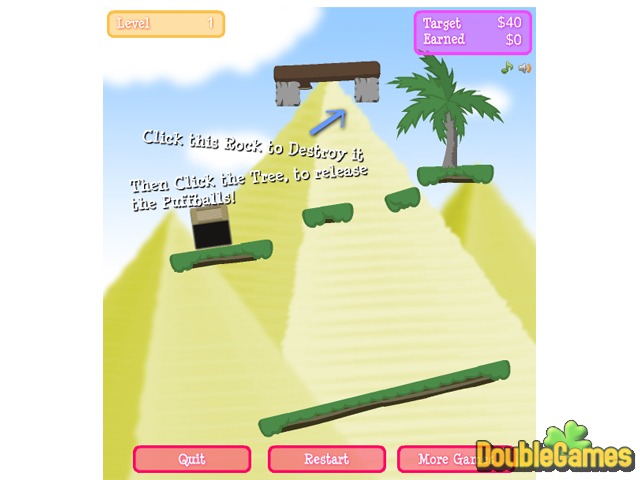 Let's play a new brain-teaser puzzle game. Welcome to Puffball Puzzles, entertaining online adventure for everyone with simple rules. Destroy the bricks and rocks and figure out how to get all these puffballs into your crates. Click on items to remove/add. Click on the puffball tree to spawn new puffballs. Collect all the puffballs and finish the level. Play Puffball Puzzles right now and for free.
