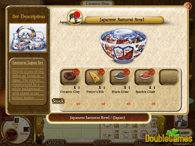 Are you up to testing your creativity? Then start playing Rare Treasures: Dinnerware Trading Company right now! This game puts you in charge of the Cavendish heirloom china company.Sounds pretty impressive, doesn't it? But the problem is that this once flourishing company is now in a mess. There's loads of work to be done.. Look for the best original patterns and ingredients to turn the inherited company into a powerful enterprise. Put your exquisite dinnerware into production again and set your business in motion. Download Rare Treasures:Dinnerware Trading Company absolutely for free!