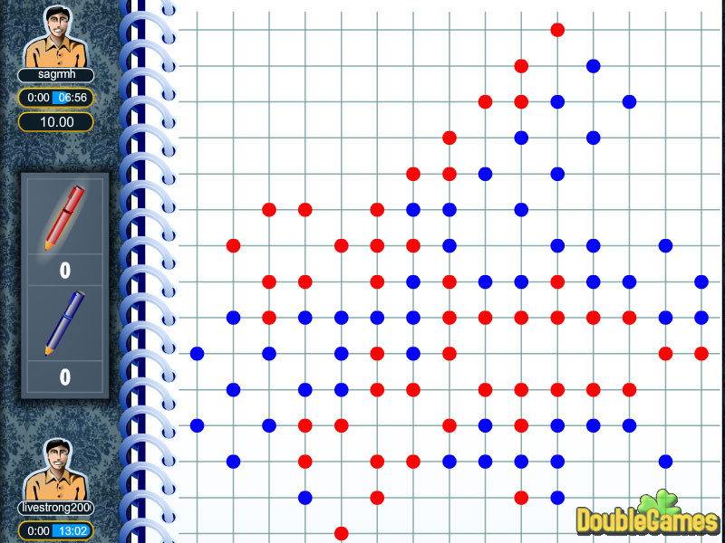The Dots is played on a regular piece of paper with little squares (often used in schools). The players put the dots of their color, alternating their moves. The first move has to be made in the center of the board. The goal of the game is to surround the dots of the opponent in such manner that is it possible to connect them with an uninterrupted line. It is possible to connect the dots horizontally, vertically, and diagonally, but only if the dots are at the corners of the same square.